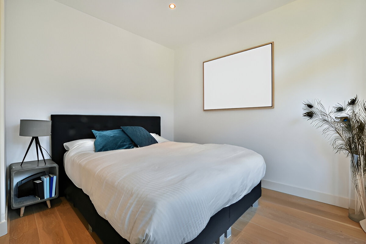 A platform bed with built-in storage is a great option for keeping the space tidy. Instead of traditional nightstands, consider floating shelves or wall-mounted bedside tables to save floor space.